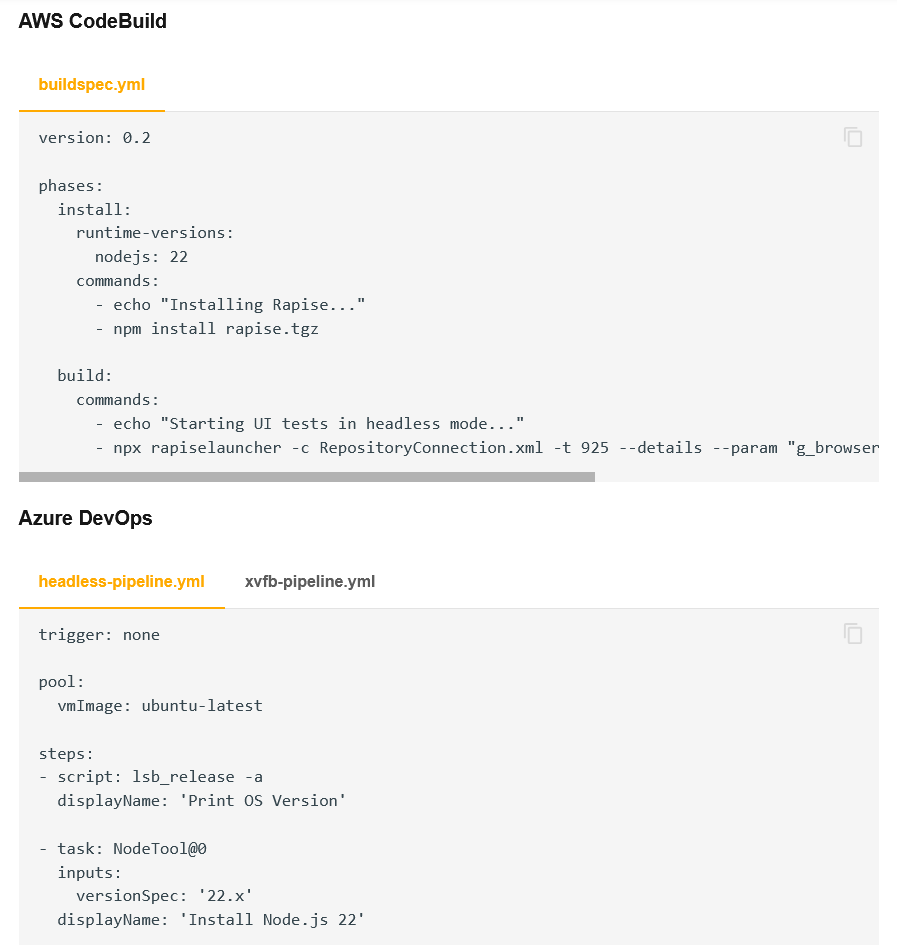 RapiseLauncher can be installed on any CI/CD pipeline that supports NodeJS. We have detailed implementation guidelines for the following common options: