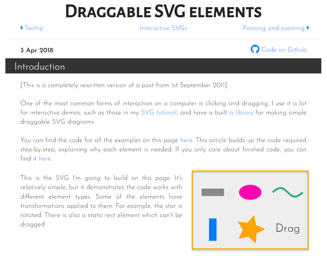 For this test we'll use the SVG Dragging Sample provided by Peter Collingridge. This application contains a simple SVG canvas that contains a few figures that can be dragged around the drawing area: