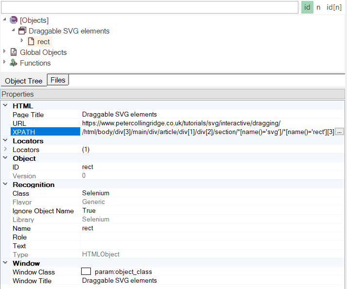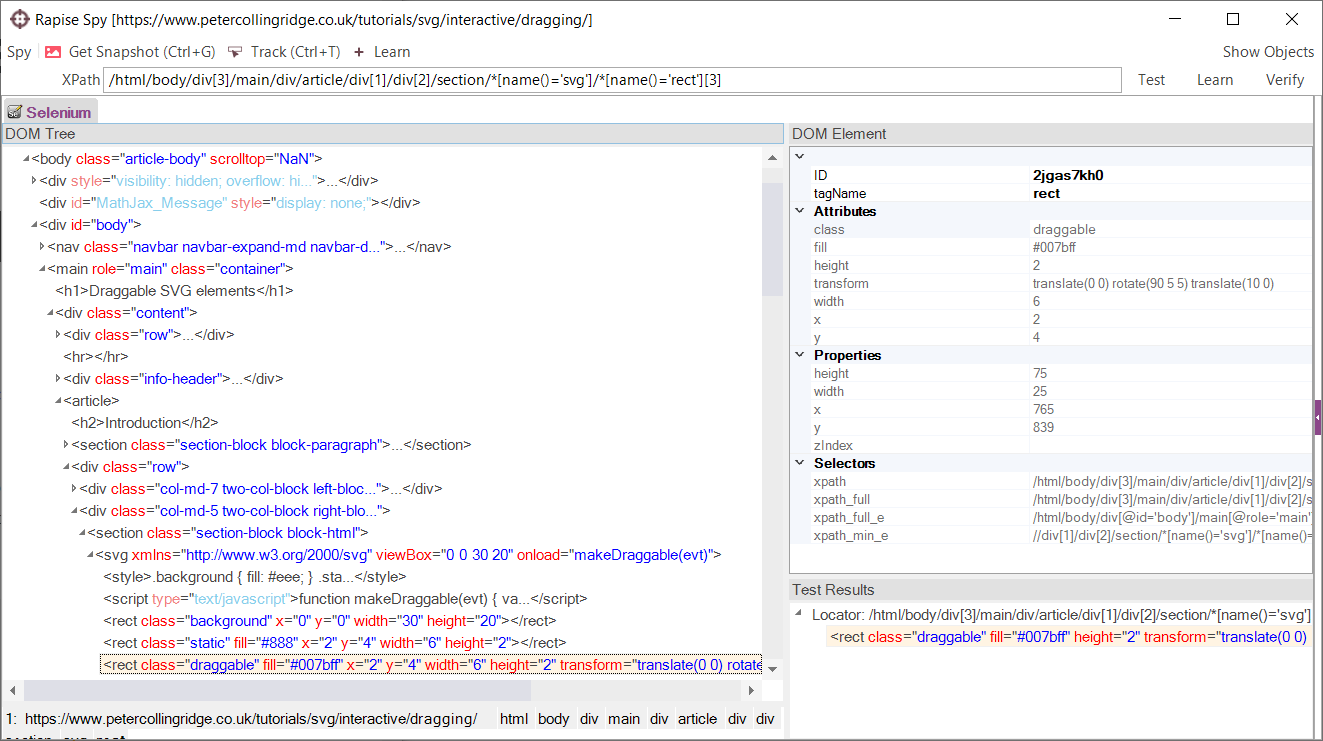The first step is to Learn the blue rectangle object. Unlike regular HTML elements such as buttons and input buttons, clicks on SVG elements are not captured by Rapise, so the easiest thing is to open up the Web Spy and view the DOM tree of the webpage: