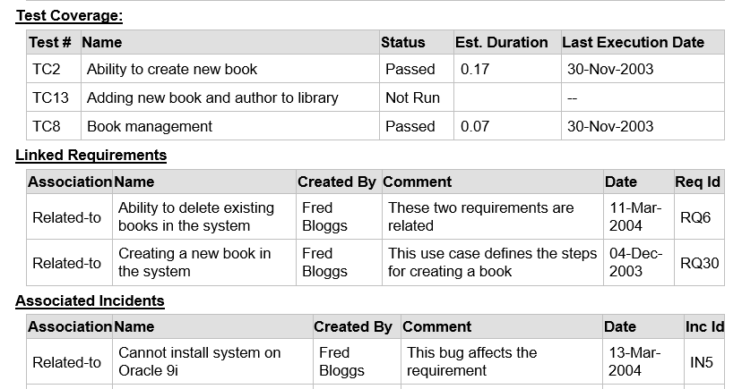 Now we don't show all of the fields for the incidents, test cases or requirements because there would not be enough room to add the columns to the document and still fit on the page.