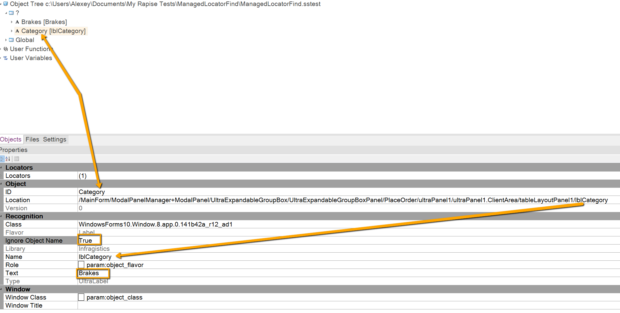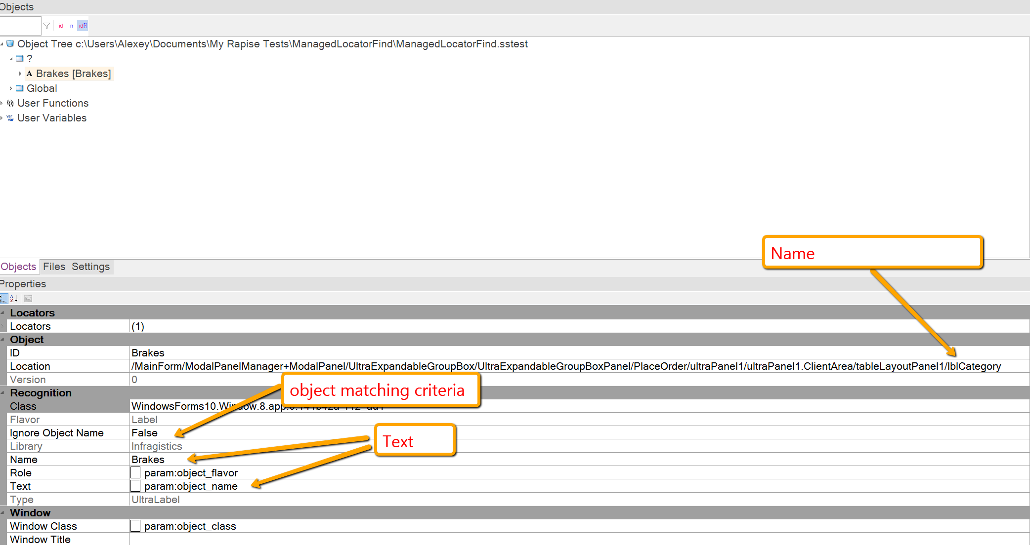 Note: An object name is detected by the heuristics. In this case heruistics knows that an element is a label so it assumes that its text may be used (in most cases labels contain static text) and checking this text becomes an additional object matching creteria.