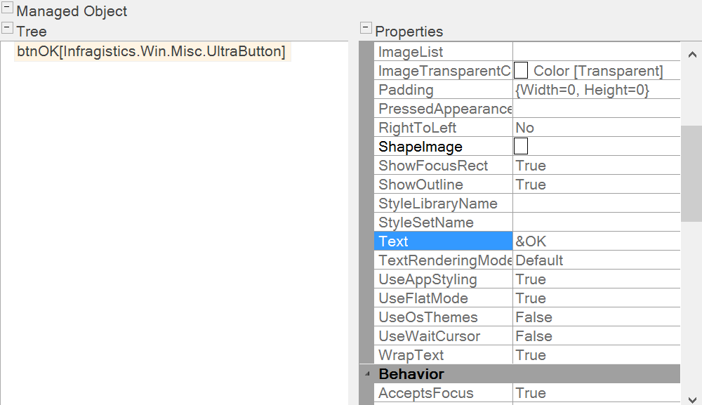Each item in the Managed object tree has Name and Text: