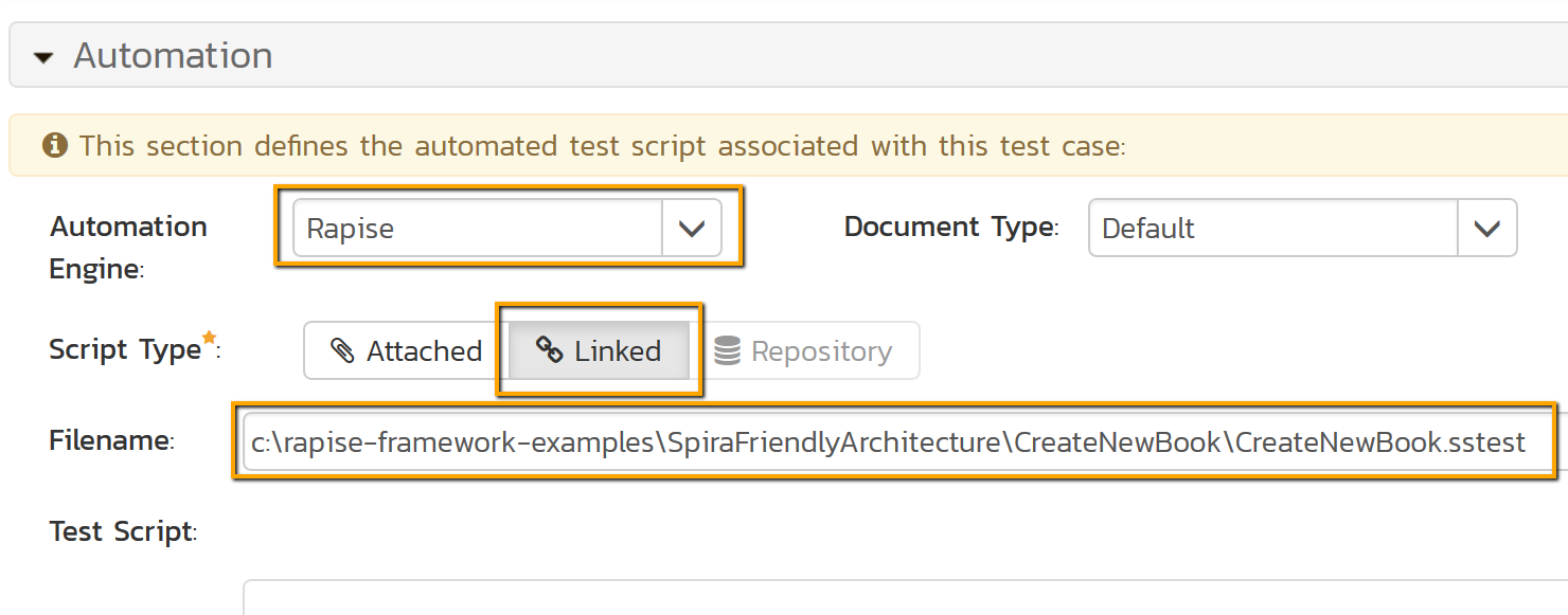 First, link your tests to SpiraTeam test cases. Plan to clone the Git repository with tests to the same absolute path on hosts where you want to execute the tests. To link a test open corresponding test case in SpiraTeam and scroll to Automation section.