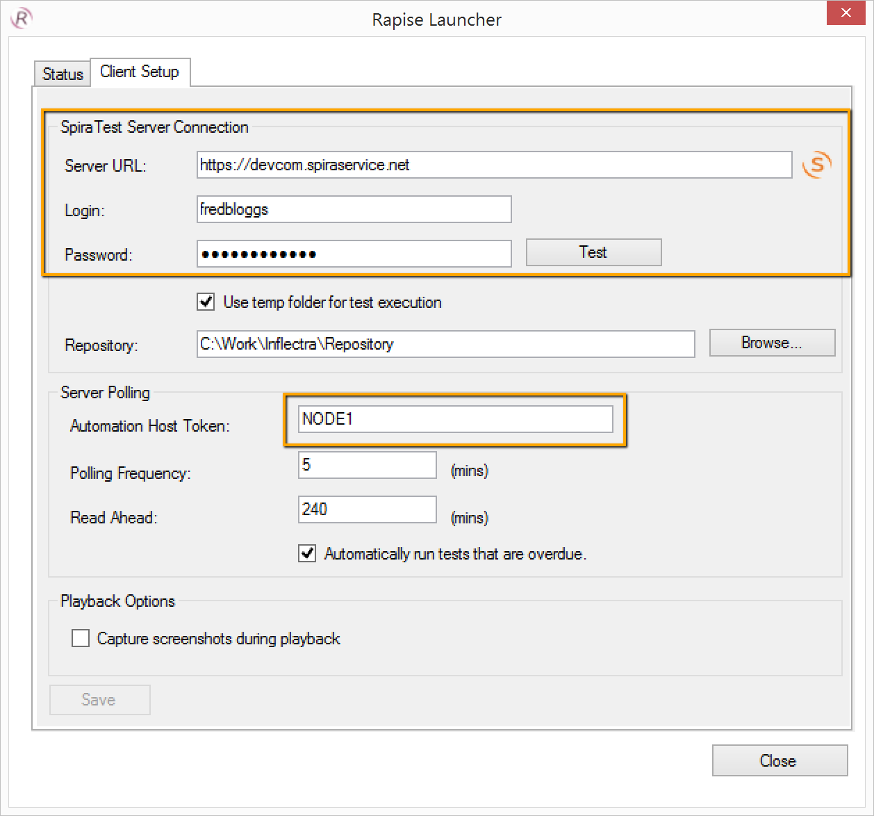 Then on the automation host specified in the test set configure RapiseLauncher. It must be connected to your SpiraTeam instance and have same Automation Host Token as specified in the test set.