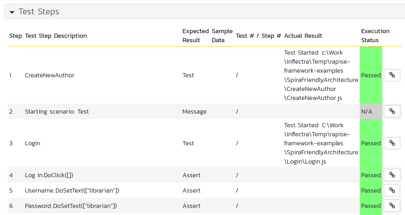 So you can clone the Git repository to the defined absolute path (in our example it is the root of the drive C, remember the filename parameter of a test case set to 'c:\rapise-framework-examples\SpiraFriendlyArchitecture\CreateNewBook\CreateNewBook.sstest') and then execute it, all with a few lines: