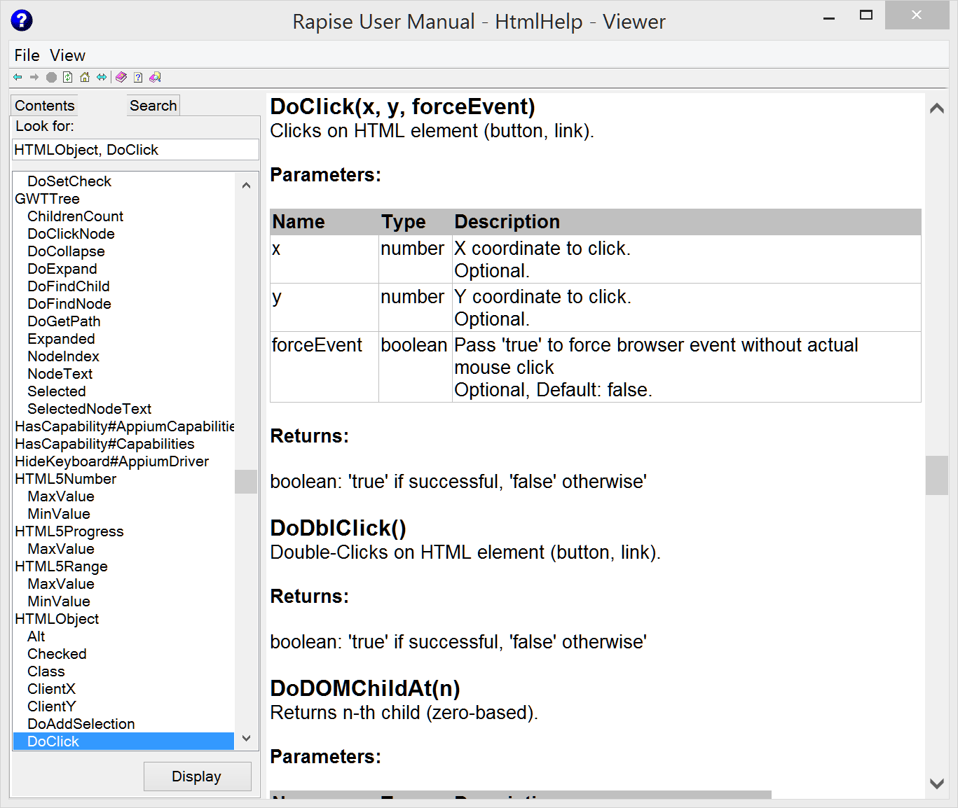 For the list of supported object types, their actions and action parameters refer to Rapise Documentation.