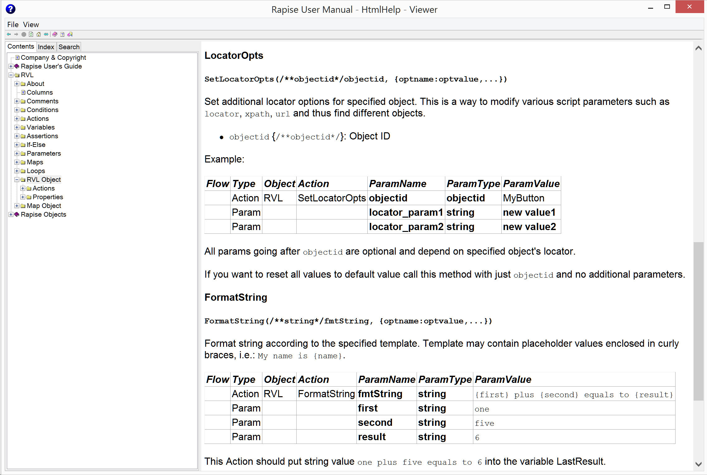 Here is the quick reference of the FormatString and SetLocatorOpts actions you can find in the Rapise documentation.