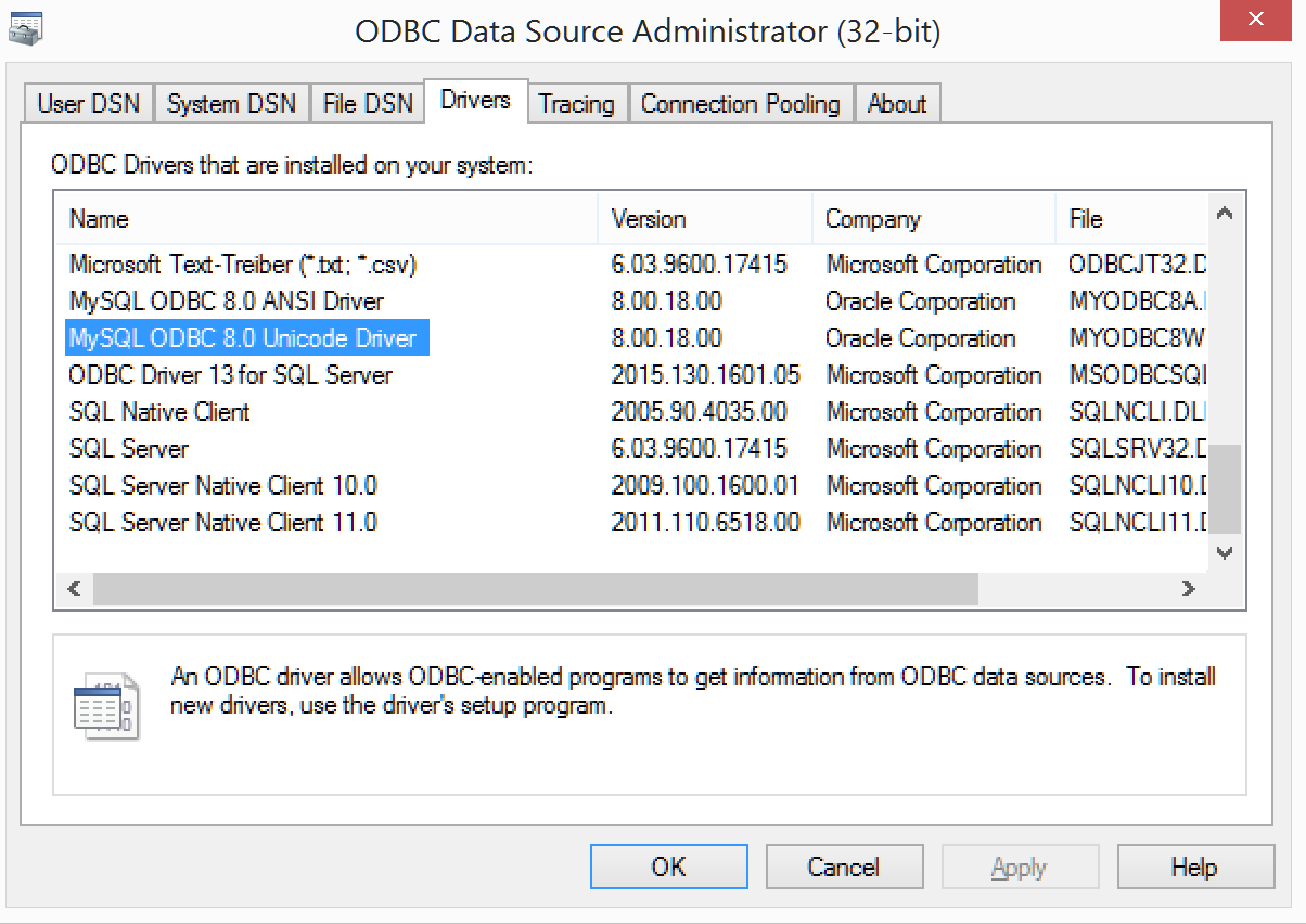 Notice the exact driver name, e.g. MySQL ODBC 8.0 Unicode Driver