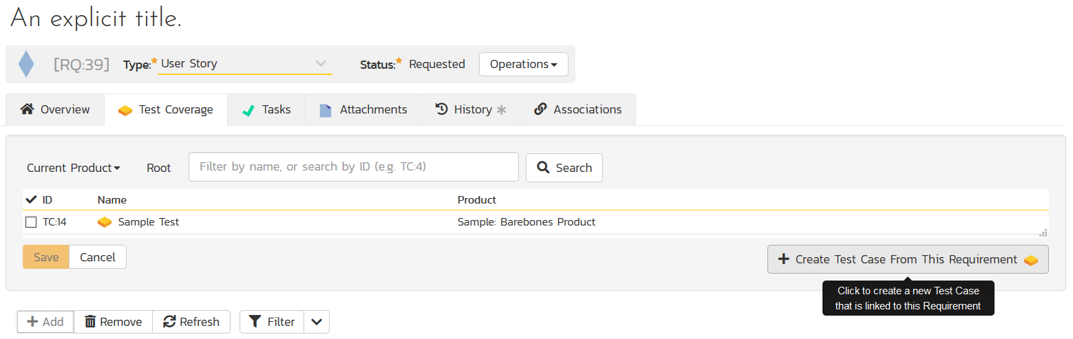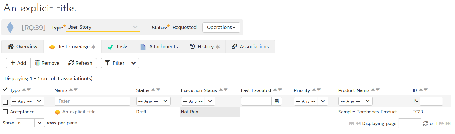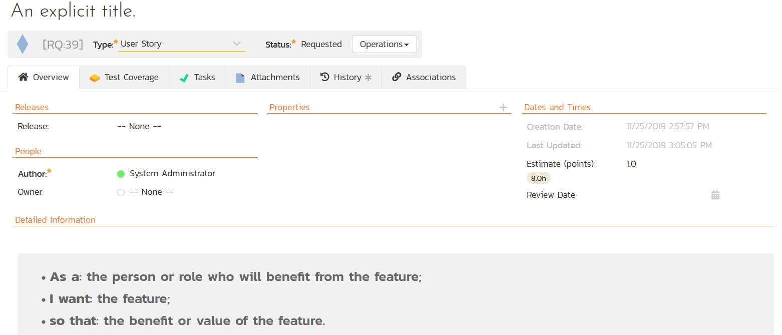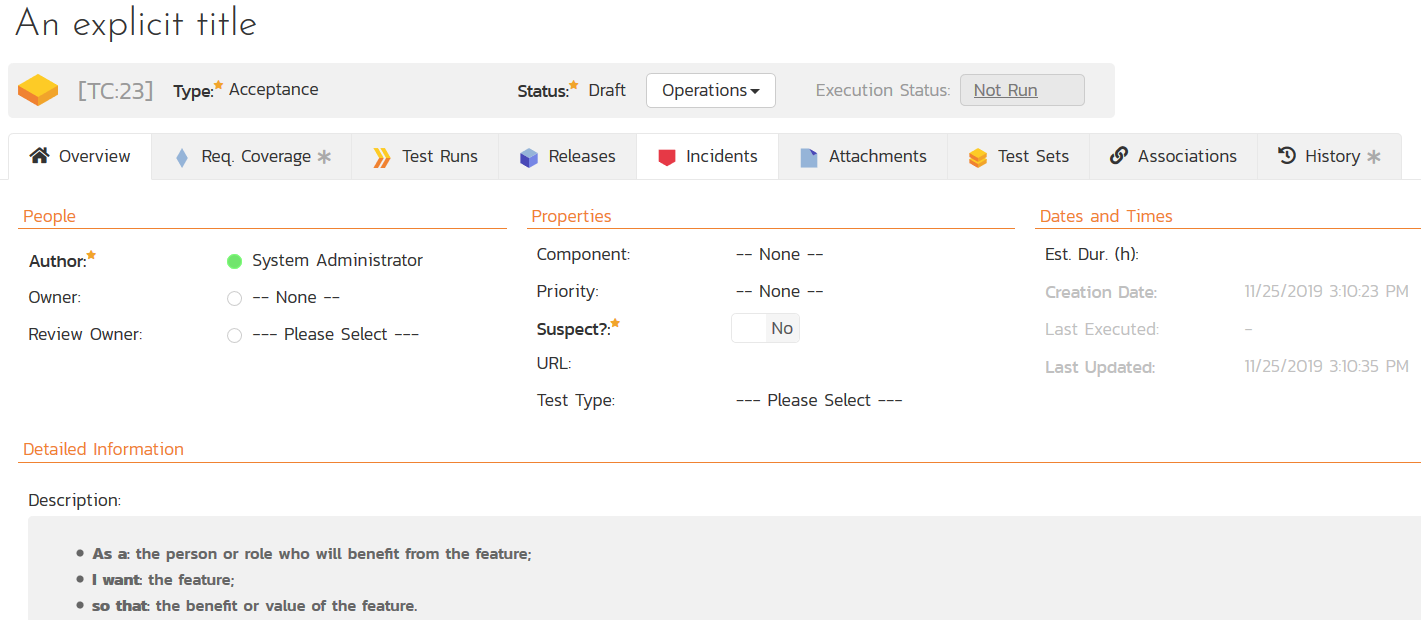 By default, the acceptance test created automatically by Spira will include the title and narrative from the original user story: