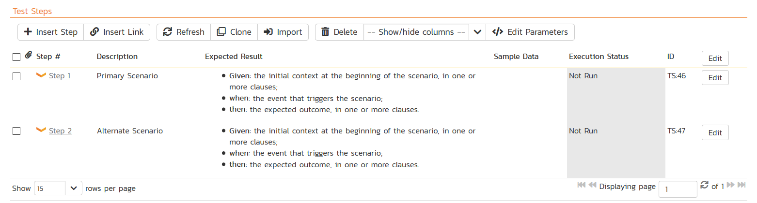 You can now use the Test Steps section to add the various BDD scenarios. We recommend the following:
