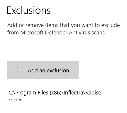 Add an Exclusion for Rapise installation folder: c:\Program Files (x86)\Inflectra\Rapise