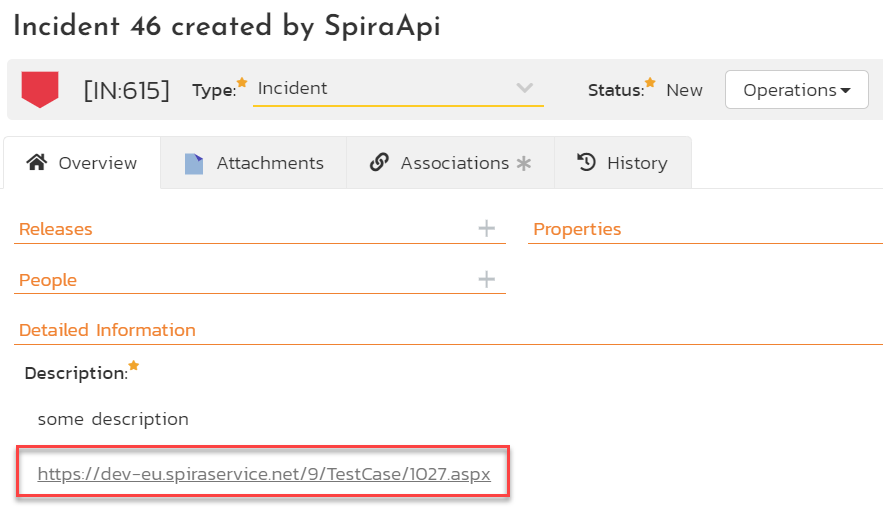 Incident description contains a link to the test case
