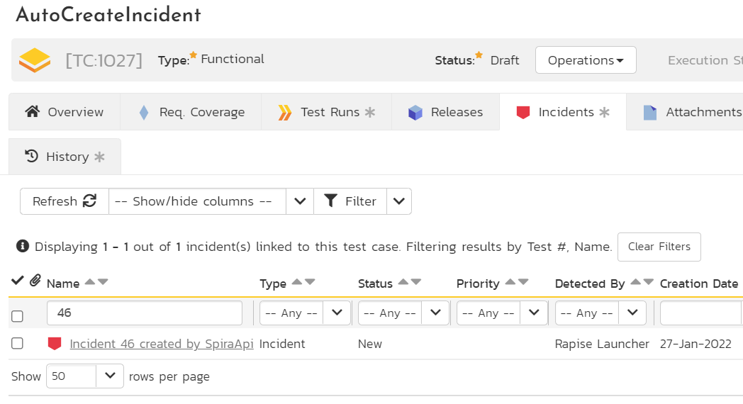 The Test Case has a link to the incident on Incidents tab