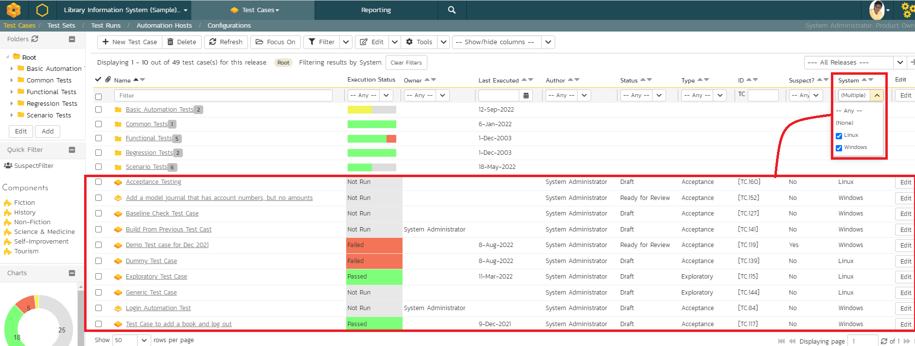 Let us also confirm that some of the test cases have this "System" custom property appropriately setup. This is show in Figure 3 below showing that there are a total of 10 test cases with 6 test cases set up for "Windows" and 4 test cases set up.