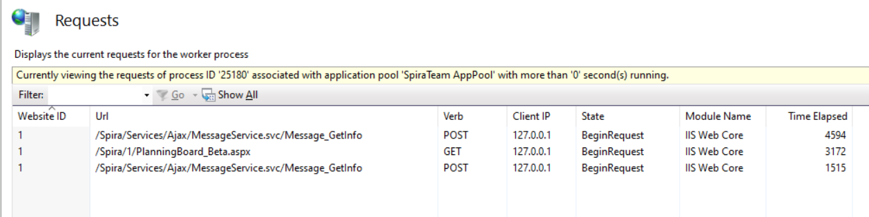 Additionally, if enabled, the View Current Requests action is available. The View Current Requests displays the current running requests in a worker process. Several fields provide data to investigate performance issues; for example, the URL, Client IP, Pipeline Module State and Module Name, and the Time Elapsed for a request.