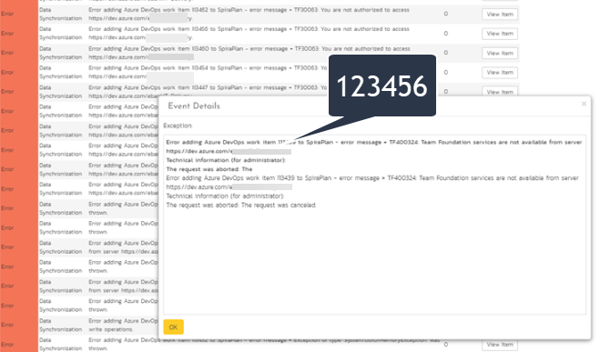 Even sync is successful, you might get error records generated in Event Log saying that there is an Error adding Azure DevOps work item 123456 to SpiraPlan (SpiraTeam/SpiraTest)