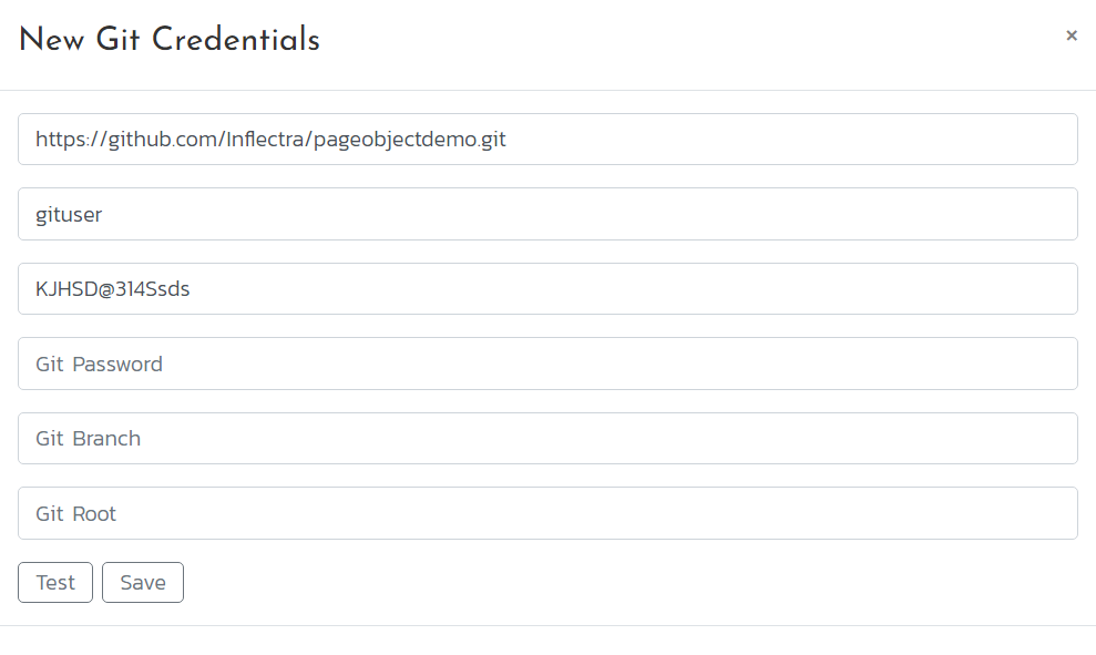 Now expand the test set by clicking on it's ID, scroll down to the Git Credentials property, double click it's empty value and select PageObjectDemo credentials.