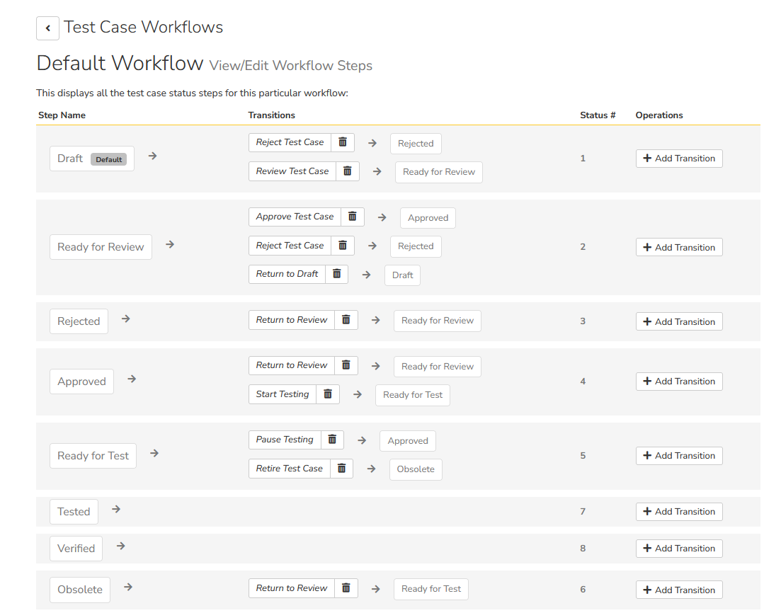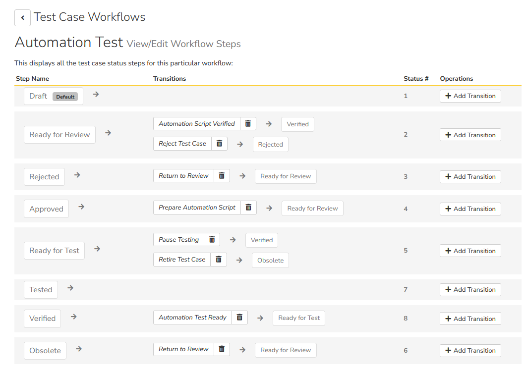 This workflow starts at the Approved Status and moves through until the Automated Script is Verified and then Ready for Test
