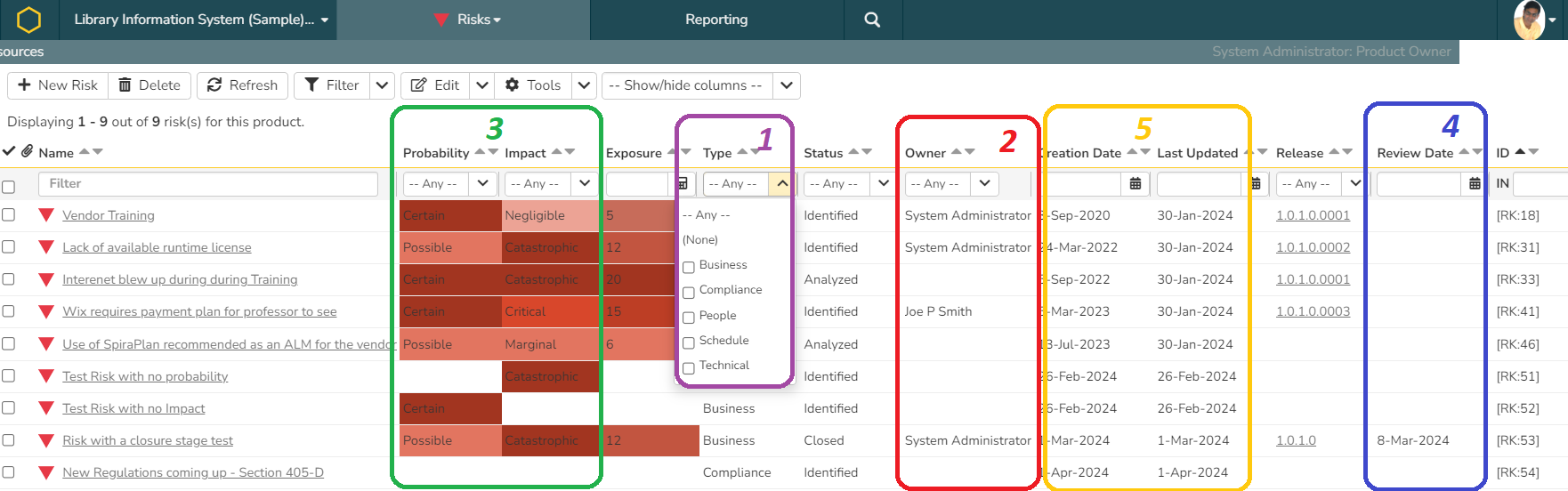 As part of the risk breakdown structure identified, risk types are identified in the risk template. One good "risk management" practice is to see if the team is somehow bias or inclined to identify certain types of risks potentially missing out on other risk types. For instance, we identified business, compliance, people, schedule, and technical risks (noted in as #1) in the diagram. But, if you look at the data, we have not identified any schedule risk at all.