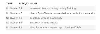 - In the select clause, we are adding a "No Owner" as a computed column and brings additional risk details (like ID and Name)