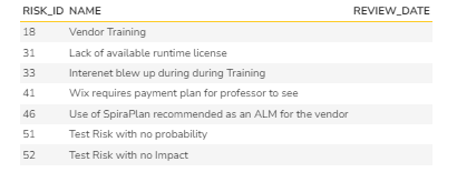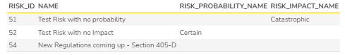 - It is possible that you can bring the "R.RISK_IMPACT_NAME is not null and R.RISK_PROBABILITY_NAME is not null" as an additional clause in the where clause. But, this has been removed primarily because smaller organizations may not have filled one of them and if we apply this clause we may miss the opportunity to evaluate the review date for such risks.