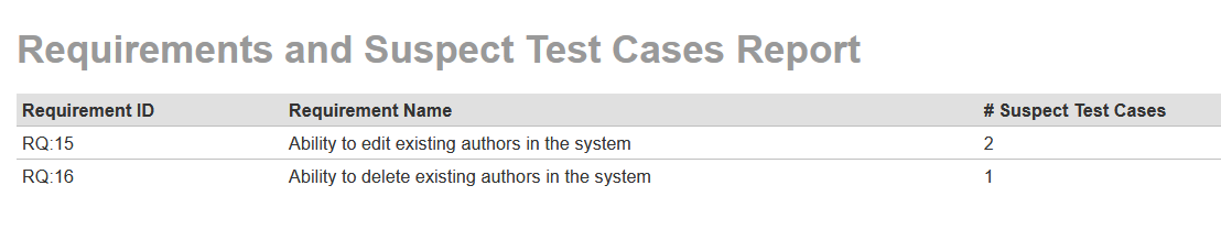 When you run the report in the sample project after you have modified several requirements linked to already approved test cases, you will see the following: