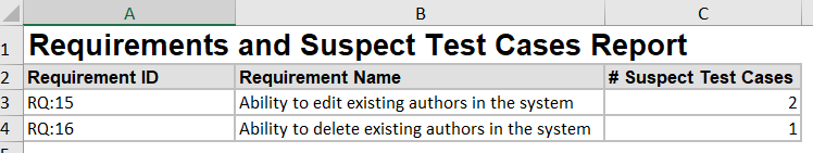 The following custom report can be used to generate a table of requirements along with the number of suspect test cases associated with them.