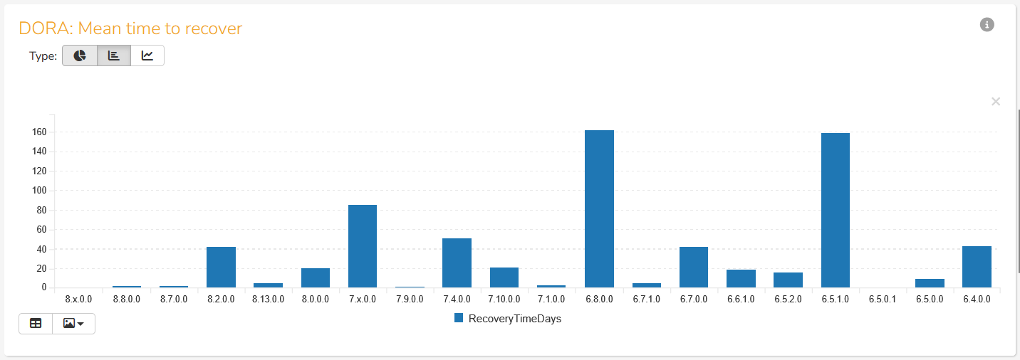 The one issue with the previous graph is that it shows the MTTR by release, but not by date. We can easily fix that by using the release end date for the x-axis instead:
