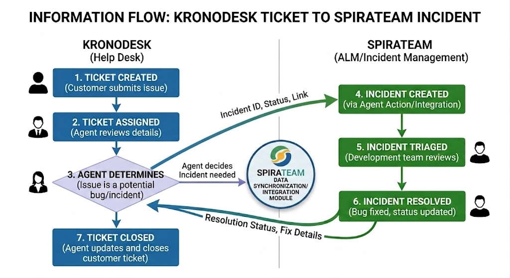 The integration between KronoDesk (Help Desk) and SpiraTeam (ALM/Incident Management) creates a seamless bridge between customer support and technical delivery. This flow ensures that customer-reported issues are accurately captured, triaged, and tracked through the development lifecycle without manual data duplication.