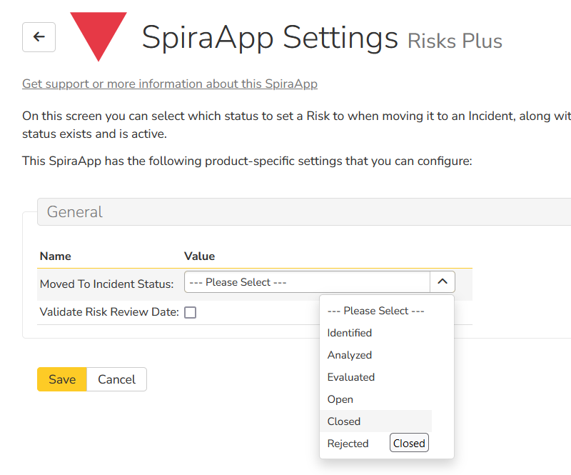 Once the new SpiraApp has been uploaded and activated, the only setting that needs to be configured is to specify the appropriate risk status that the risk will be switched to upon creation of the new issue: