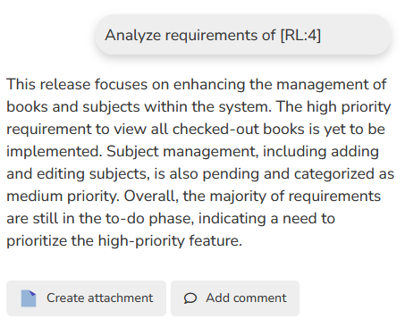 The initial version of the functionality will look at the requirements attached to a release - including such attributes as their priority, progress and status - and use that to compile a summary of the release. We plan on extending it in the next versions to also consider other artifacts such as incidents, test cases and potentially risks.