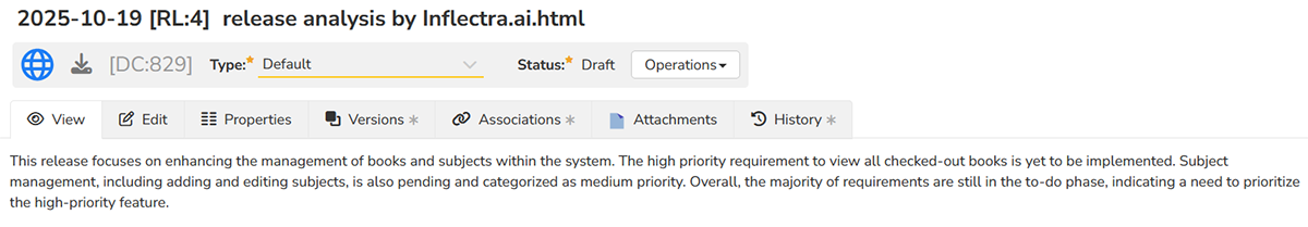 Using the new Inflectra.ai sidebar for the Release details page, you will see the following operations available: