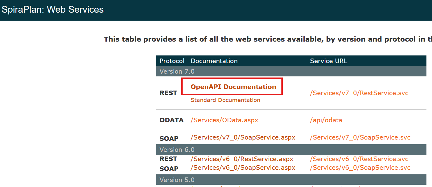 When you browse the Inflectra API documentation server, you will see the different API versions supported by Spira, with the option to display the original documentation (now called "Standard Documentation") and the new link to display the OpenAPI format documentation: