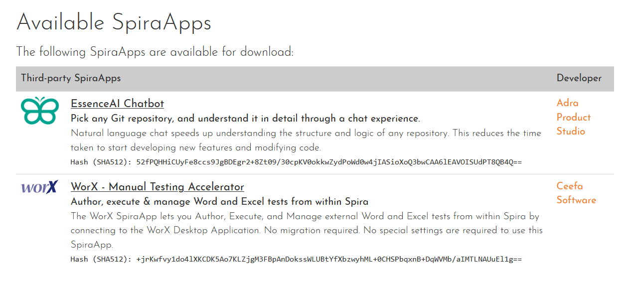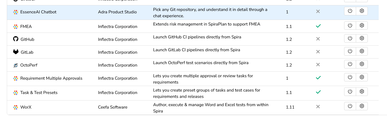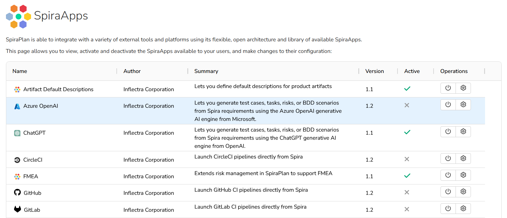 After much work by our product teams, we are excited to announce that we have opened up our SpiraApps ecosystem to third-party developers for the first time. With the new version of Spira, we have updated the design of the grid that shows you which SpiraApps are installed in your instance and whether they are active or not: