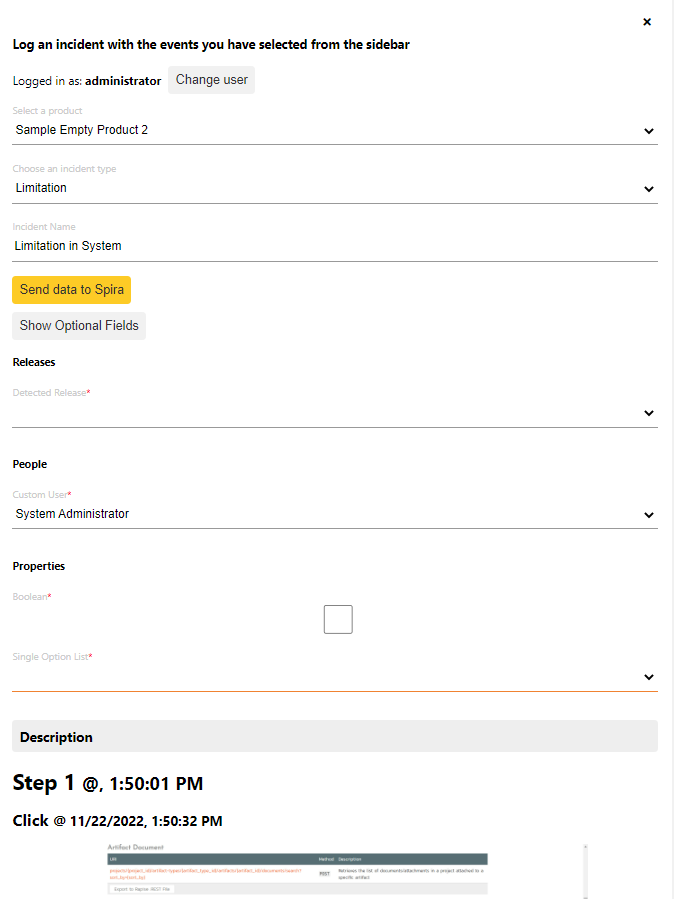 SpiraCapture now provides the ability to fill out the incident details form in a similar way to how these details are filled out within SpiraPlan. This allows SpiraCapture to be a one stop shop for incident creation in SpiraPlan during exploratory testing.