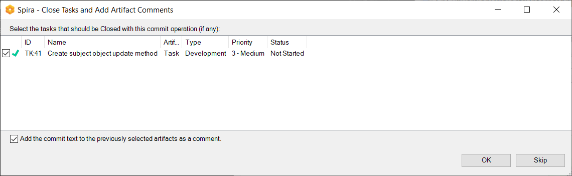 Check the box of any tasks that you want the plugin to automatically close for you in Spira. If the source code revision completed all the work on the task, you should check the box. If the revision was merely part of the task, you should leave it unchecked.