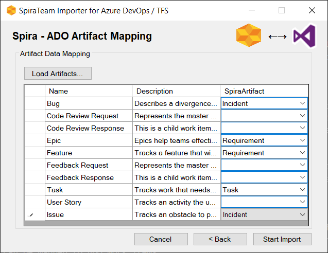 In the previous version of the migration tool, it would automatically choose which ADO work items would map to SpiraTeam requirements and incidents. This meant that if you had customized your ADO/TFS installation considerably, some of the work items would migrate as the wrong artifact type.