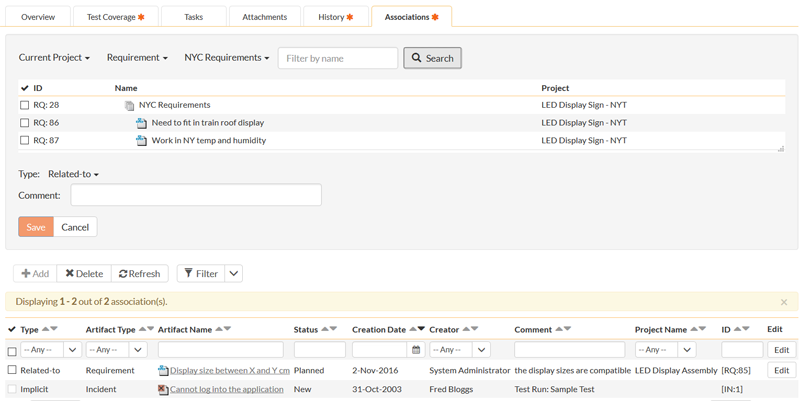 Once you have setup the project sharing, the new Associations panel lets you more easily link artifacts: