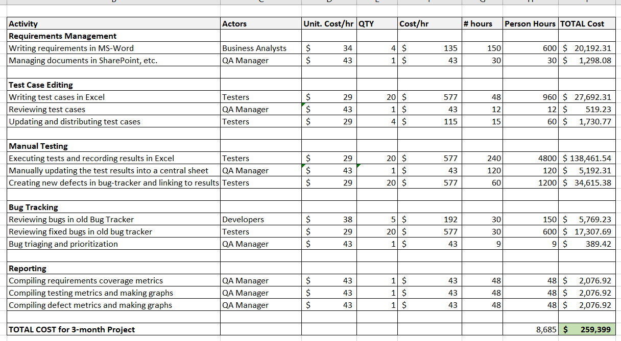 To make this process a bit easier, we have created this handy SpiraTest Business Case Estimation spreadsheet. This spreadsheet should not be used 'as-is', but should be customized to meet the specifics of your organization.