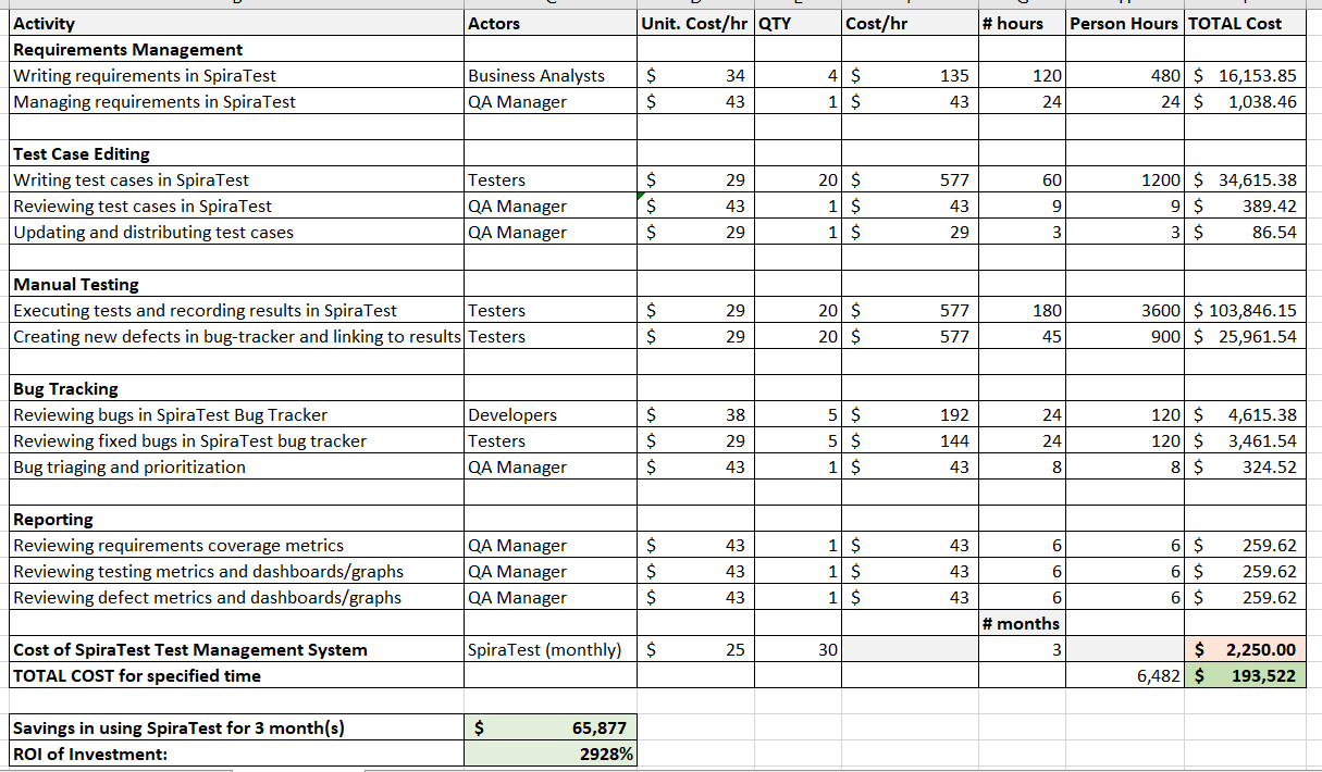 Often we get asked the question, how do you determine the Return on Investment (ROI) of purchasing and using SpiraTest to manage a team's requirements, test cases and defects. If the organization in question is using another tool (for example Micro Focus / HP ALM) it is easy, you simply compare features and license cost. However what is the ROI and business case for teams that are using manual methods, using MS-Word and MS-Excel instead of a tool? This is a bit trickier to calculate, so don't worry - we've put together a handy spreadsheet to help you out!