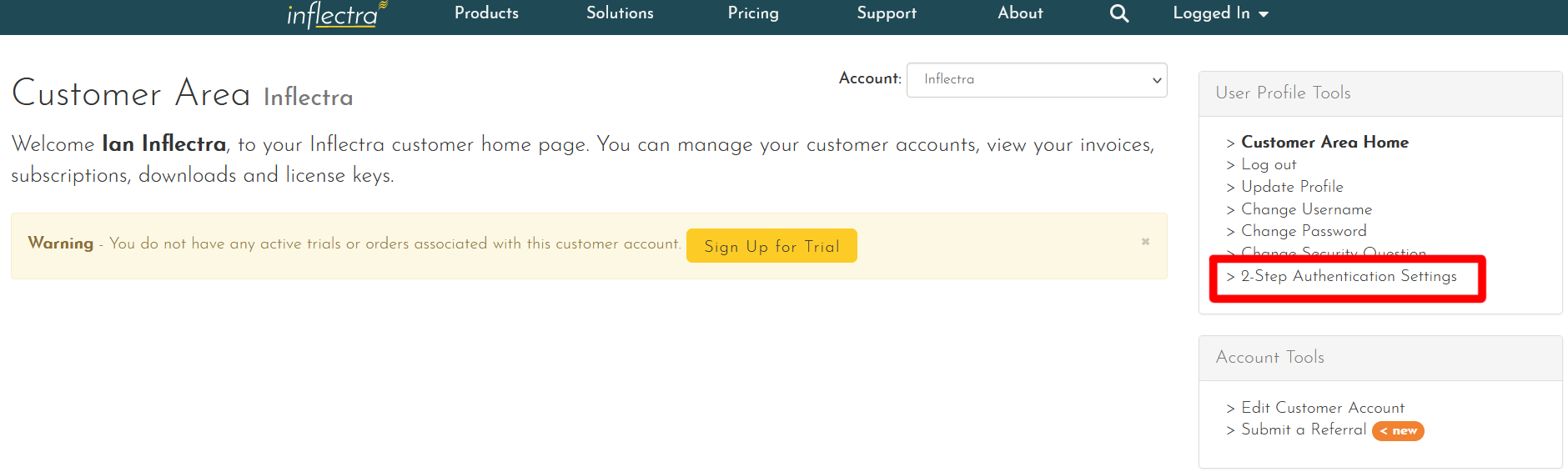 To add MFA to your Inflectra customer account, simply log into your customer account as normal and then click on the 'Add 2-Step Authentication' option in the sidebar:
