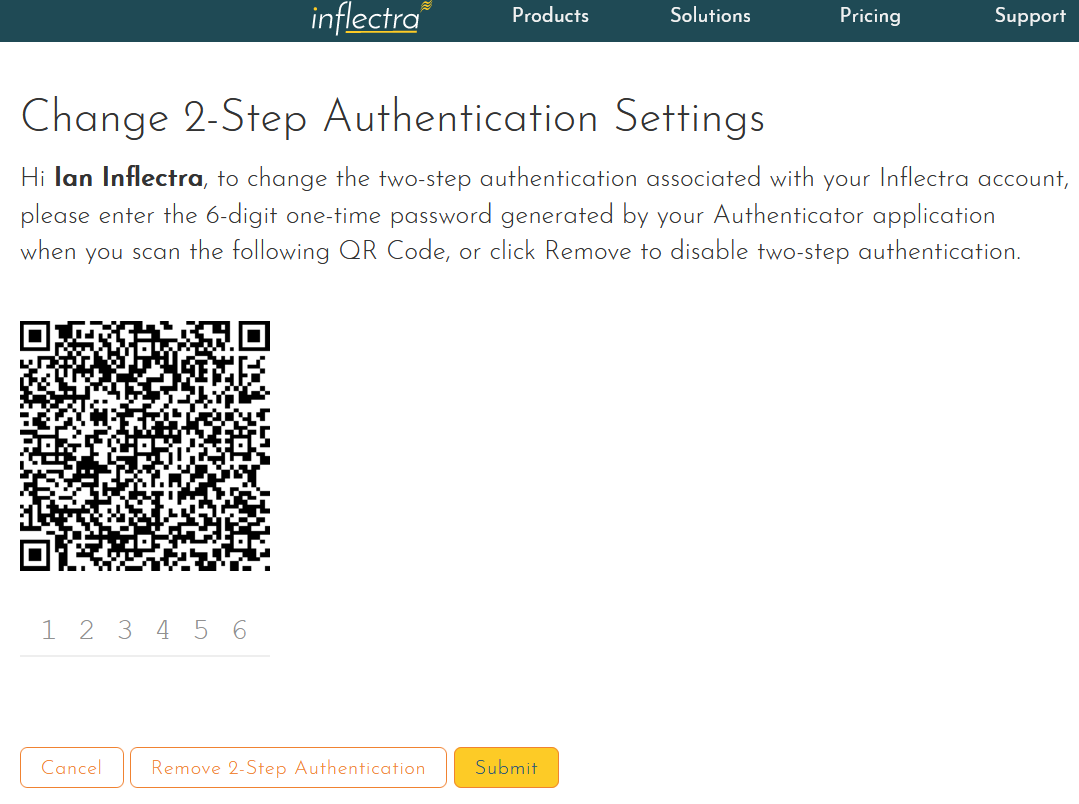To verify that the QR Code was successfully scanned, use the authenticator application to generate a sample 6-digit code, enter it in the box, and click Submit.