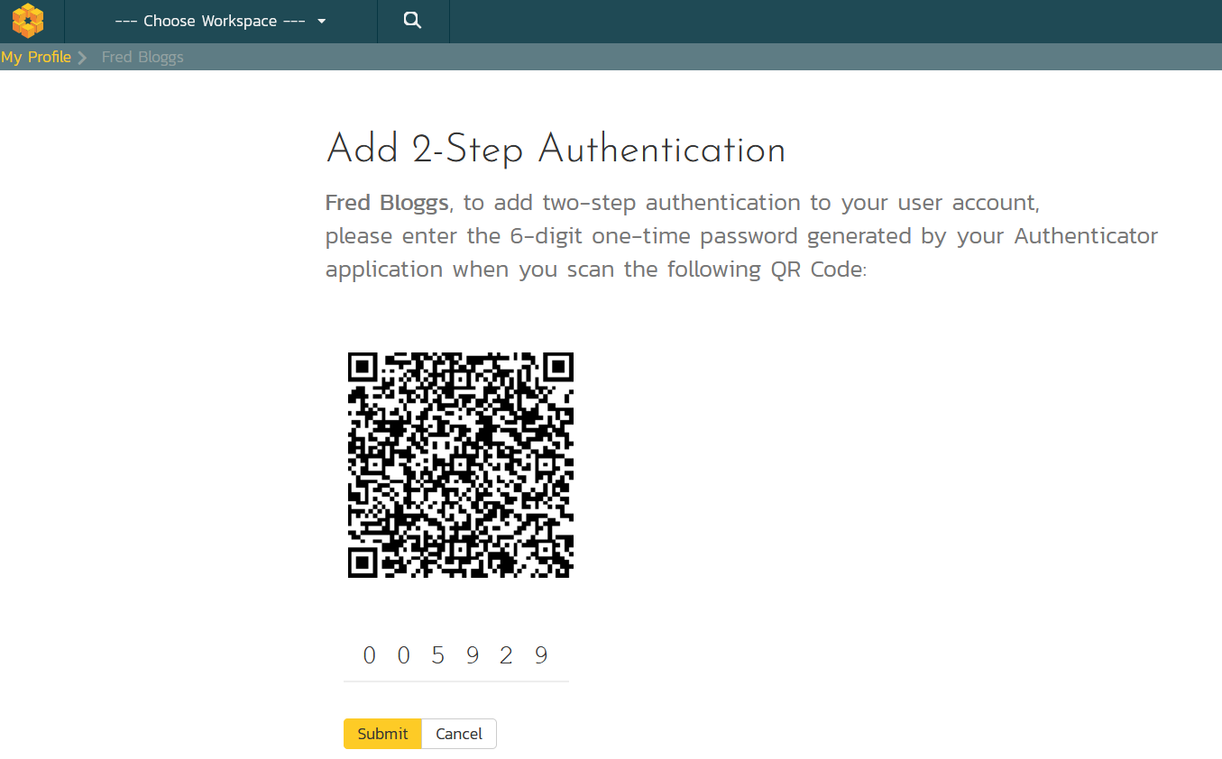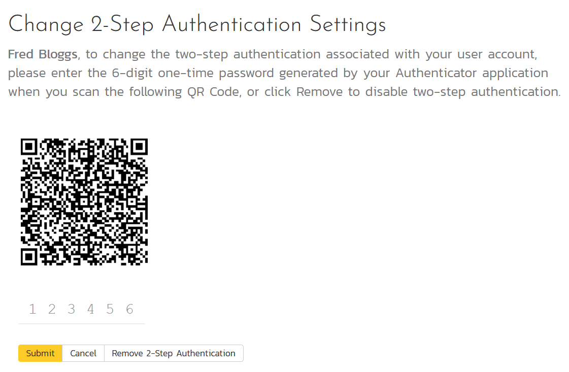 To ensure that the QR Code was successfully scanned, use the authenticator application to generate a sample 6-digit code, enter it in the box, and click Submit.