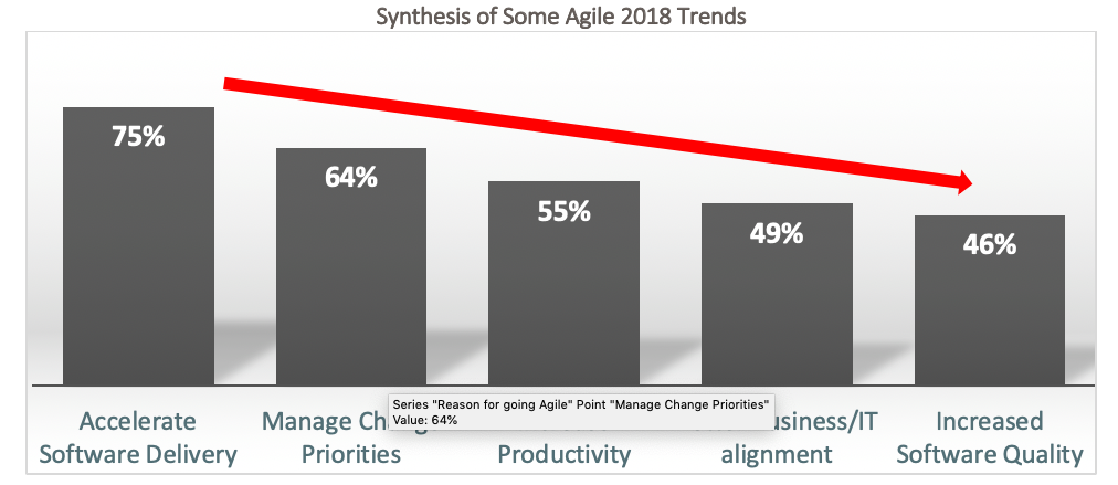 If the reason for poor quality is because of linear waterfall thinking associated with plan-driven approaches to software development, then, how much has agile really solved poor software quality? Synthesized from the annual State of Agile survey published in 2018 by Version One and illustrated below, adopting agile has only claimed 46% increased software quality while allowing accelerated software delivery among changing priorities. Working within the agile teams, productivity is still not greater and alignment between business and IT is not at its highest.