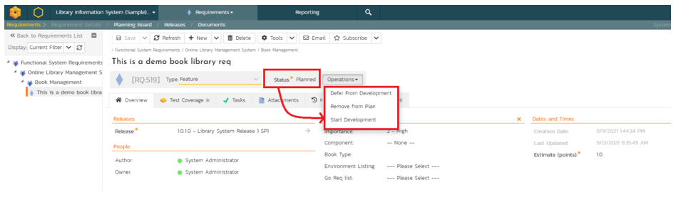 The completion may be recorded on the individual backlog items that move through the various status. Spira provides a robust requirement workflow to facilitate this movement where the assigned owner can mark the status by executing the appropriate transition operation on the requirement. This is demonstrated in Figure 6. Furthermore, Spira’s comment feature (not shown in Figure 6) can also be used to document observations to preserve the context for any decisions made.