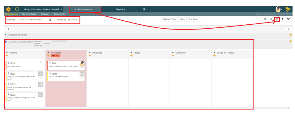 If the requirement status has not already been updated, the team can leverage the tracking board under the requirement’s panel in the daily standup. The tracking board allows the team to see all the requirements by various statuses. This can be accomplished by selecting the specific release and the status in the Group By section as illustrated in Figure 7. If readers wonder about the background color on the In Progress lane, this color coding demonstrates Spira’s support for Kanban, where a limit is put on work-in-progress. Readers can follow the Kanban WIP article for more details.