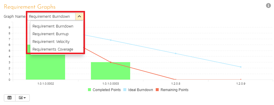 Another popular activity that happens in the daily standup is an update on the burn-up, burndown, and velocity charts. Here too Spira comes to the rescue where such details need not be manually tracked. With the requirements moving through the statuses, the charts are automatically updated in the “Requirements Graph” widget for the team to review, inspect, and adapt. This requirement graph is shown in Figure 8 below. In addition, Spira provides numerous widgets to track progress at the project, requirement, task, build, testing, and defect levels.