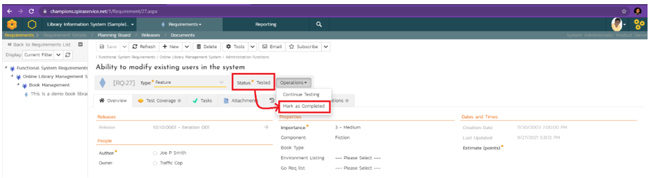As you may have guessed already, the workflow operations at the requirement level can be used for this purpose (as shown in Figure 9). Here, readers can see the “Mark as Completed” transition operation to move the requirement from the “Tested” state to the “Completed” state. This specific section of Spira allows the product owner to also add comments as appropriate, such as tracking an electronic signature to this approval if the regulatory and compliance nature of the product requires it. Spira allows the transition operations to be configurable with many options for what fields must be required, hidden, or disabled, execution options, notification options, and electronic signature. These configurable options are not shown in Figure 9.