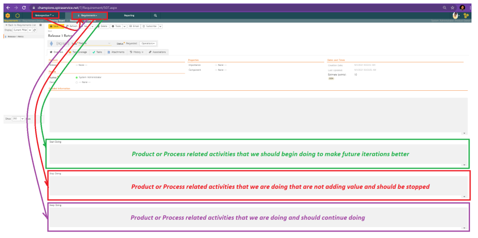 In Figure 10, a new project, “Retrospective” is created where three rich-text-field custom properties are added to the requirement. These properties represent the activities that the team must start doing, stop doing, and keep doing. These activities can be related to a product or process. Subsequently, the backlog in the appropriate Spira product can be populated with requirements related to product and process, brought into the iteration planning immediately, and implemented accordingly.