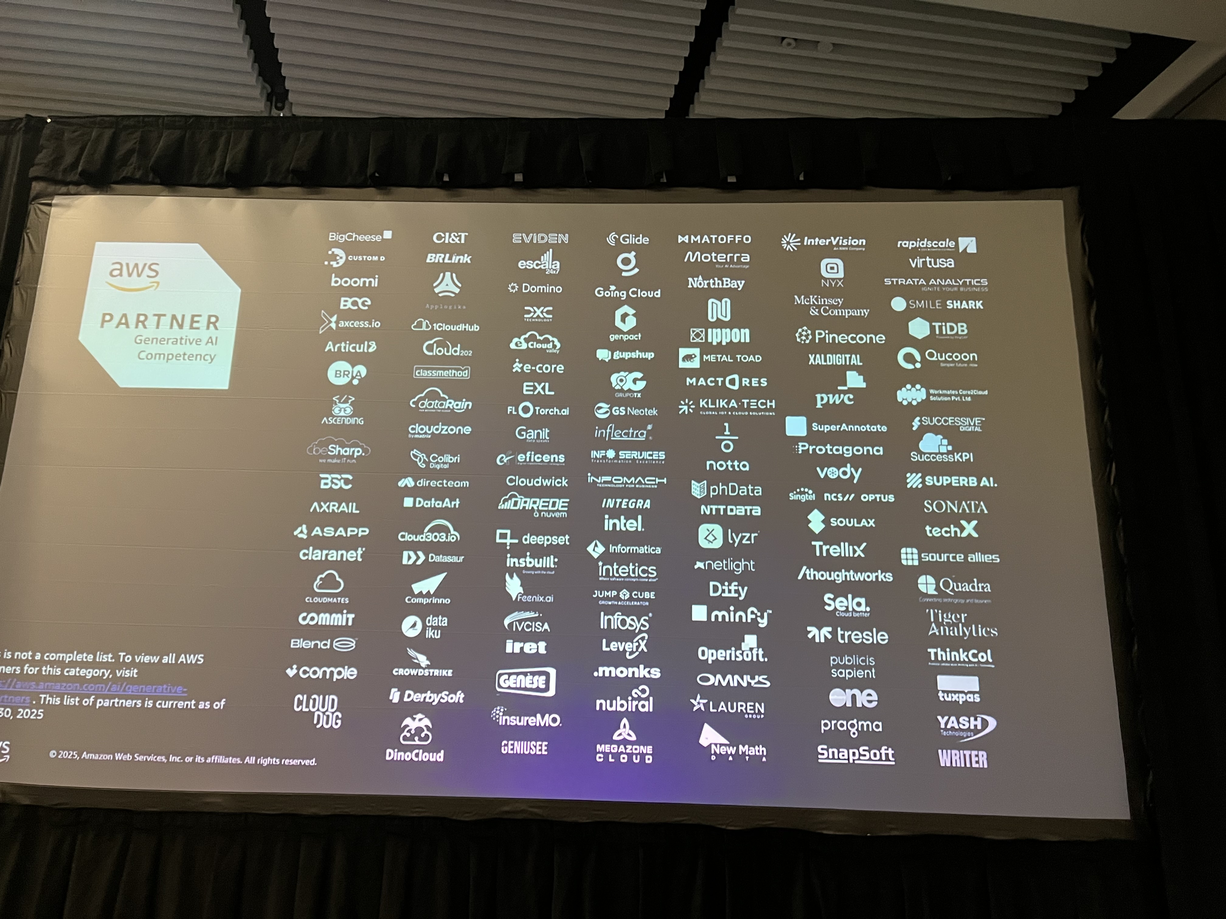 Our team attended various sessions, including a deep dive into Generative AI, strategies for Marketing for Success, and tactics for engaging Industry Markets. Adam also had the opportunity to attend an executive breakfast and dedicated roundtable for Generative AI Competency holders, where leaders discussed how we were moving into the world of AI agents. (See if you can spot our logo below among the list of AWS GenAI Competency holders!).